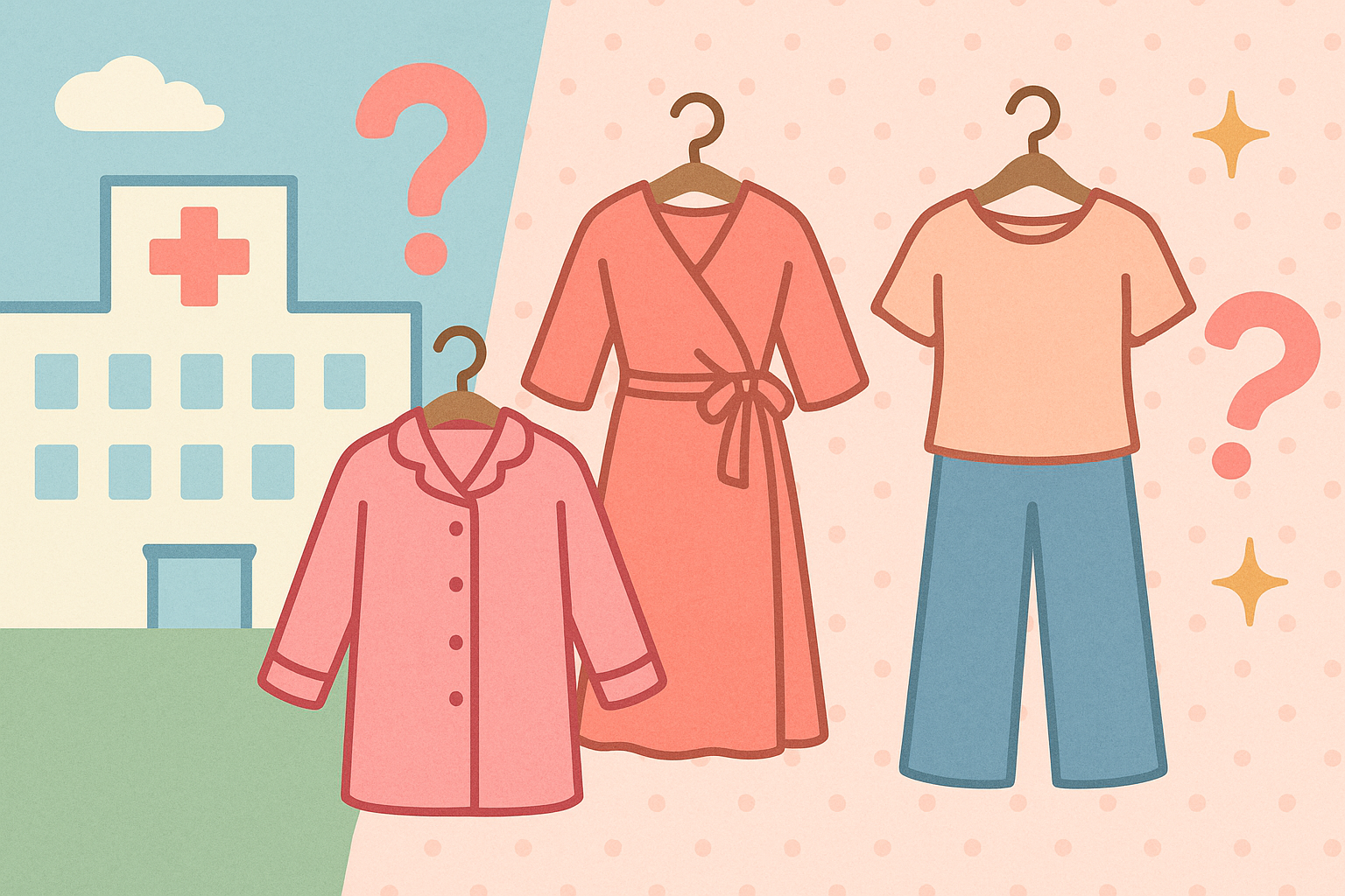 | ワンピースはOK? | 産科では前開きワンピ型を推す案内例も。一般病棟は可否が分かれるため、事前確認が確実です。 |